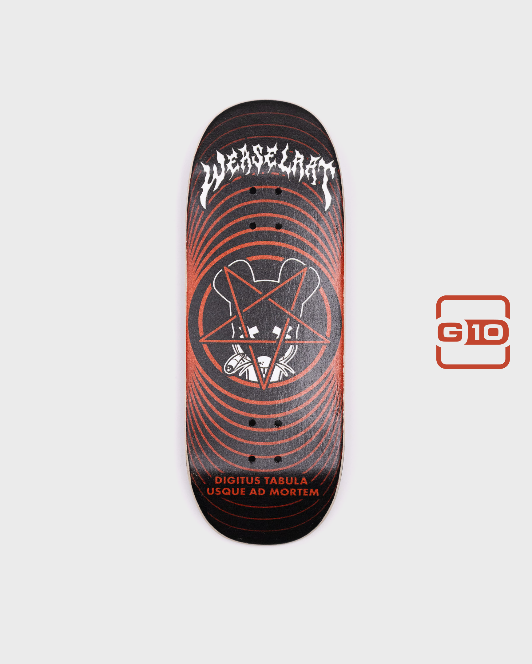 This Street Rat has a G10 glass ply in the middle. It's the same stuff they make knife and gun handles out of. It's tough as nails and as close to indestructible as we've come with a fingerboard deck. This time, instead of the bottom, we put that shit in the middle. You get all the familiar cozy feelings of hard wood on your fingers, with so much extra stiffness, you'll need an onion browser to see the photos we took of it.