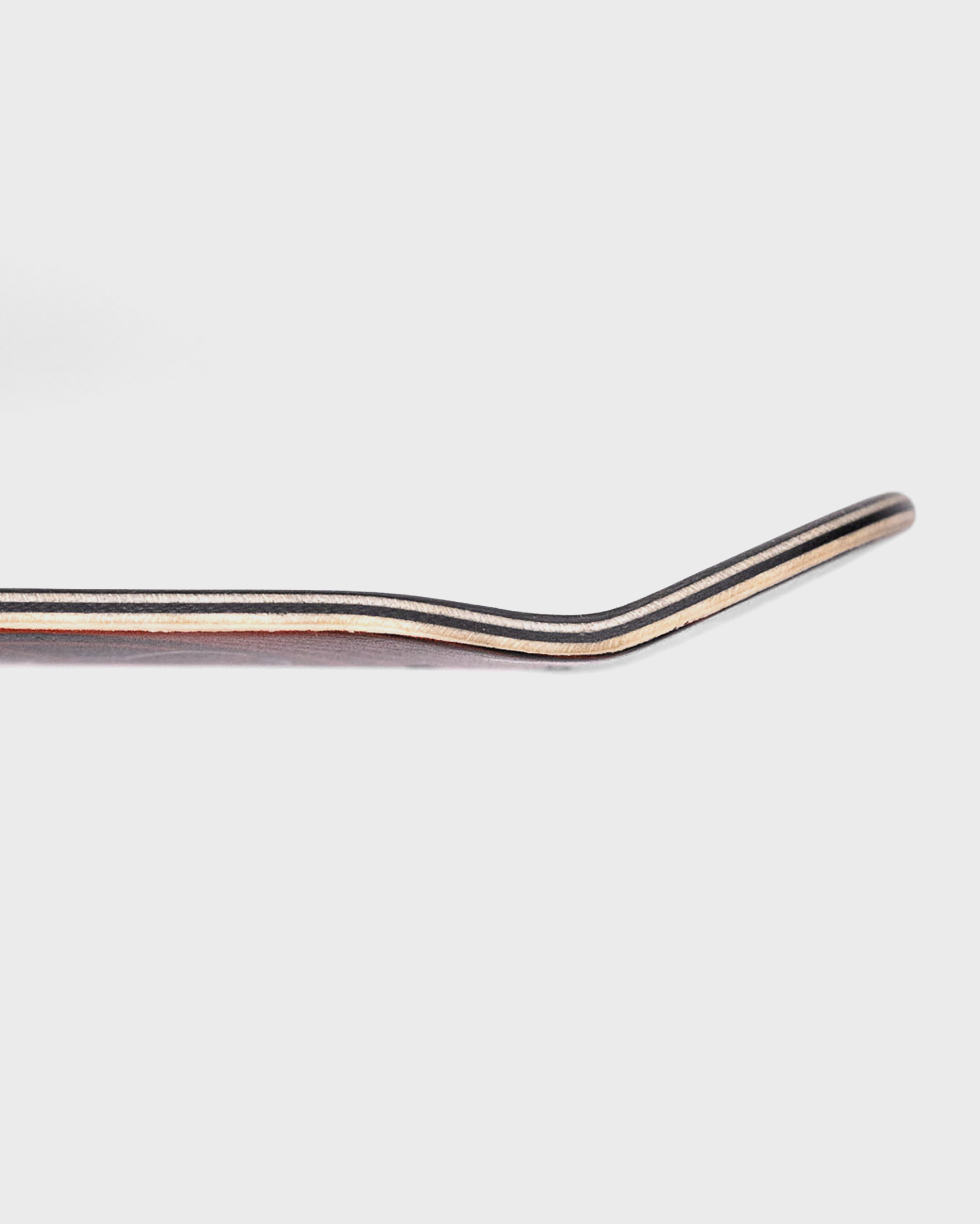 This is the gnarliest deck we make. They take a lot of extra time and effort, but the feeling of one of these is totally worth it. The ply layup is unconventional with two 45 degree maple plies sandwiched with two lengthwise plies and the G10 layer right in the middle. This is the formula for unrivaled pop and torsional stiffness! Seriously, take a deck you have, and one of these, twist em both, and feel the unrivaled nastiness of the G10.