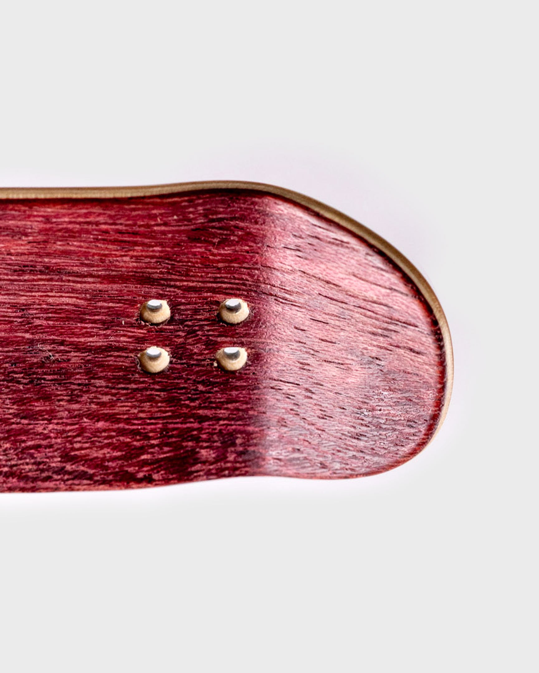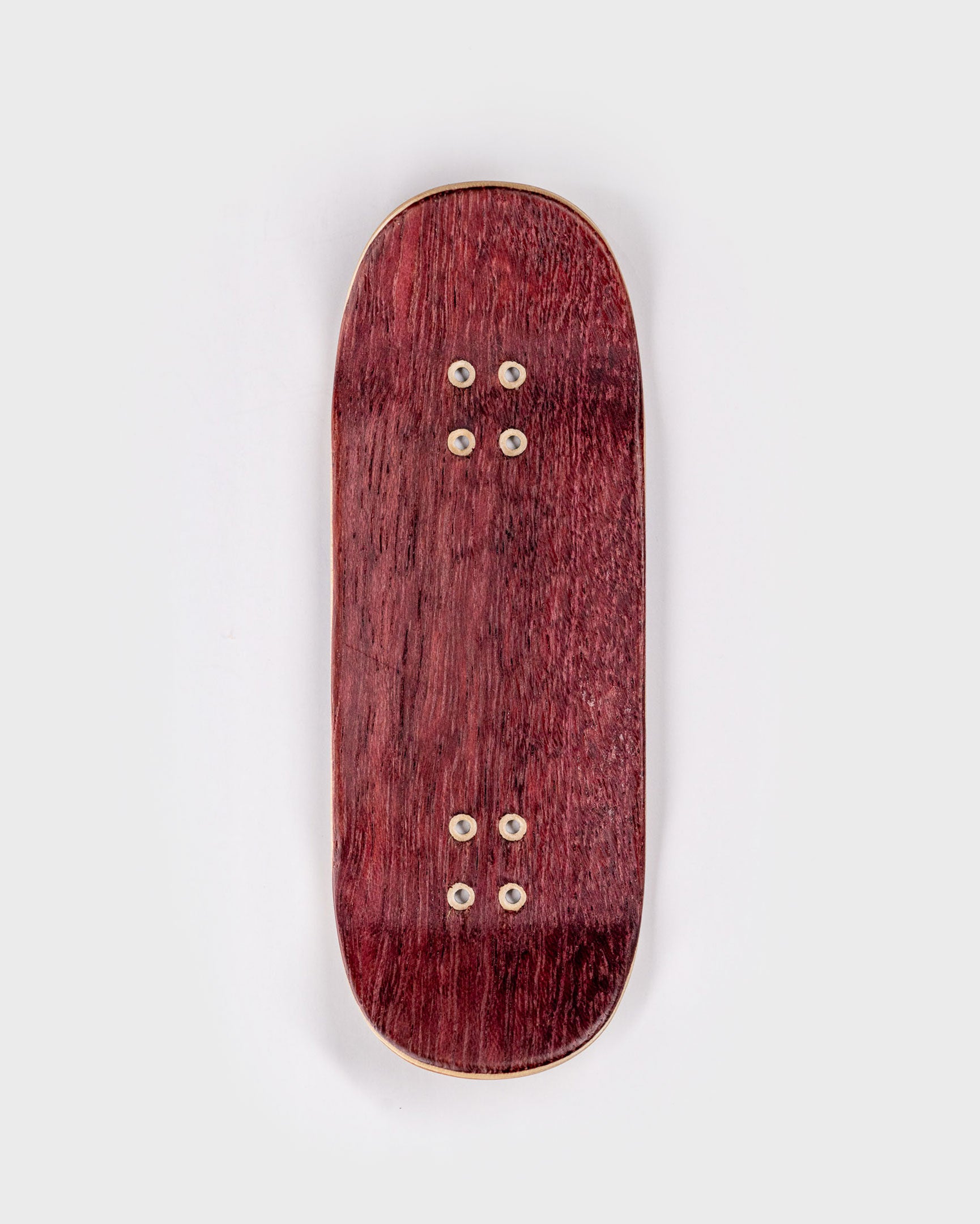 This Street Rat has a G10 glass ply on the bottom. It's the same stuff they make knife and gun handles out of. It's tough as nails and as close to indestructible as we've come with a fingerboard deck. We printed directly on the wood ply *beneath* the G10 ply, for a cool, translucent "soda bottle" look. Top ply is purple heart, finished in our house mineral oil/beeswax mixture.