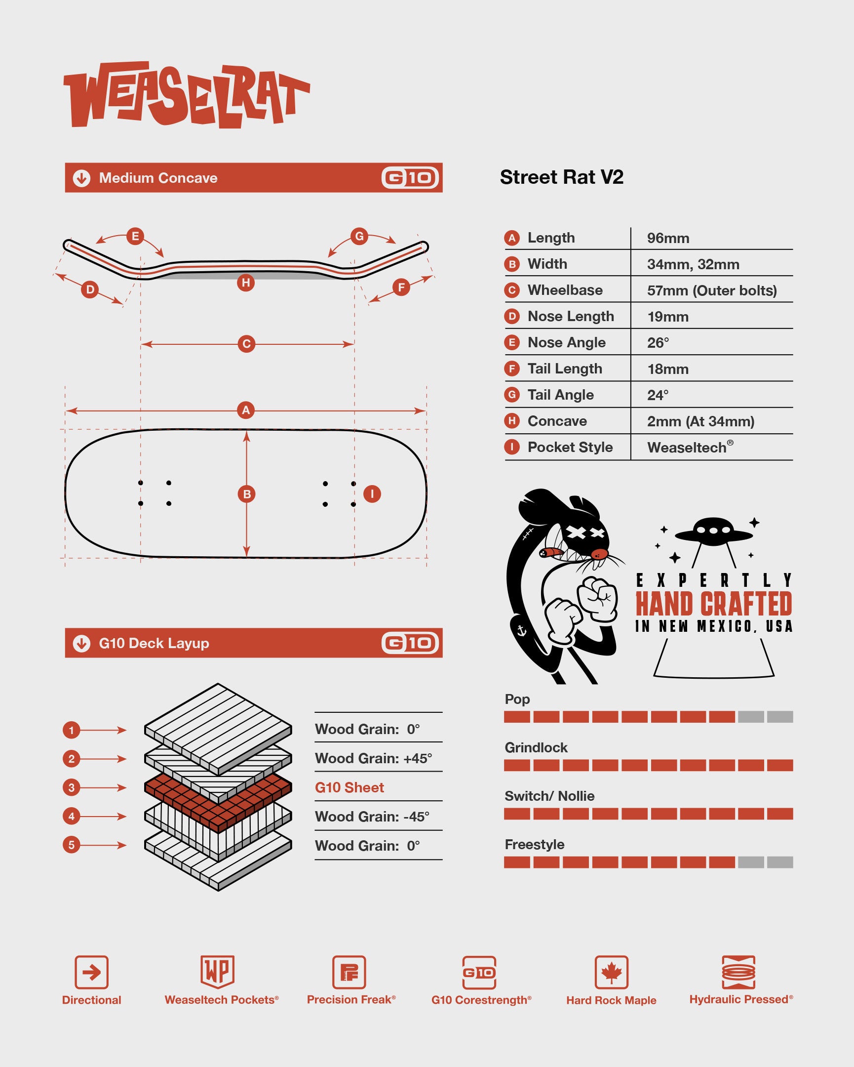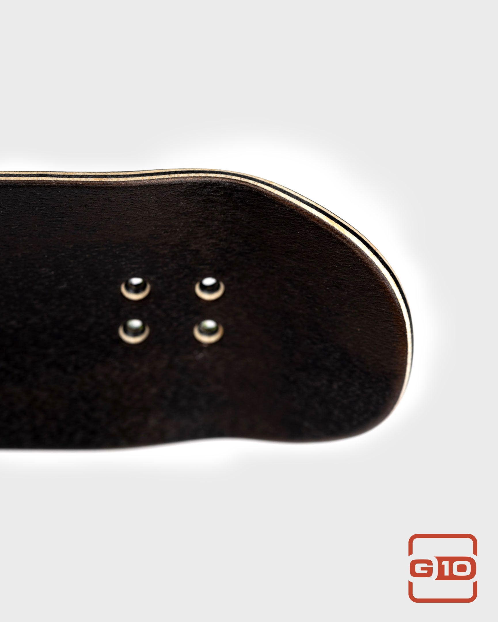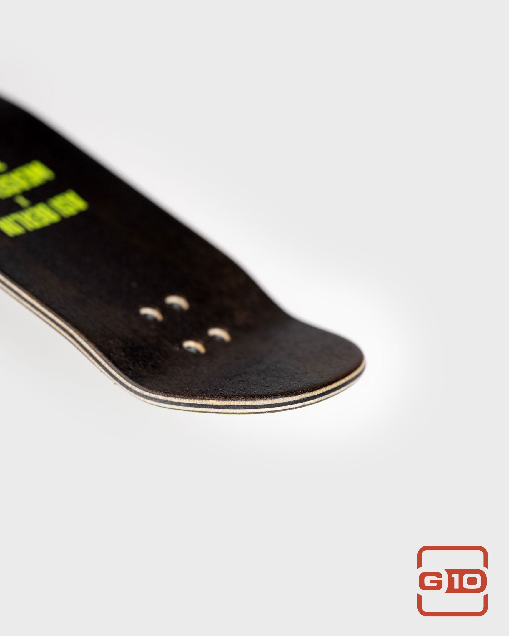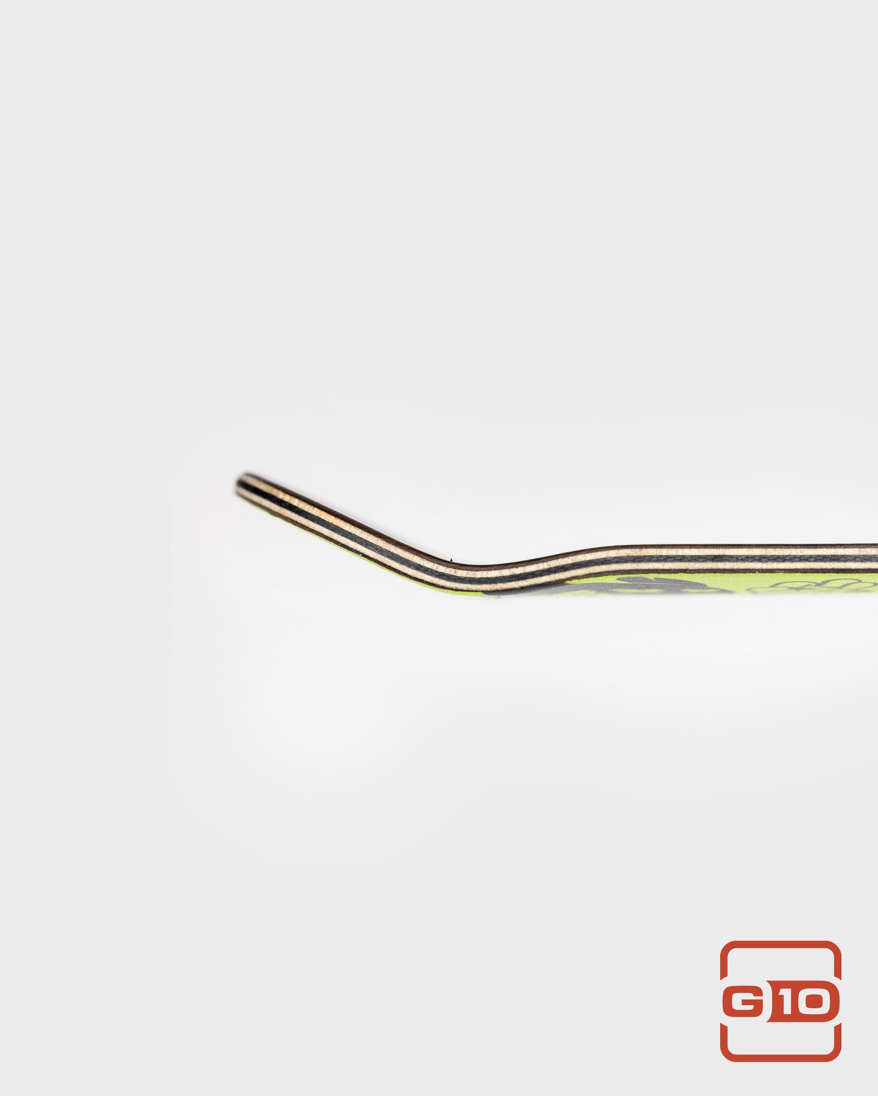 This is the gnarliest deck we make. They take a lot of extra time and effort, but the feeling of one of these is totally worth it. The ply layup is unconventional with two 45 degree maple plies sandwiched with two lengthwise plies and the G10 layer right in the middle. This is the formula for unrivaled pop and torsional stiffness! Seriously, take a deck you have, and one of these, twist em both, and feel the unrivaled nastiness of the G10.