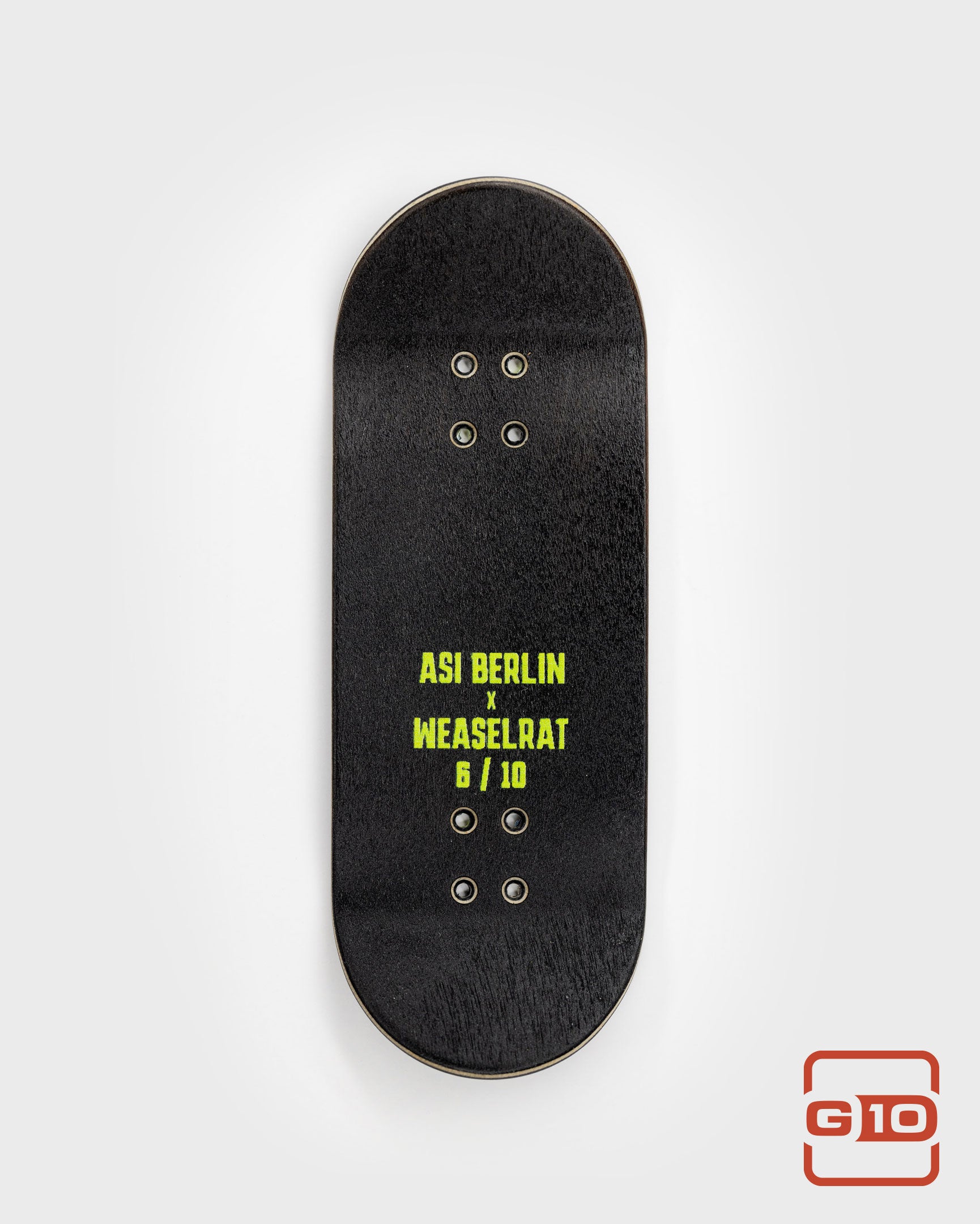We have an ultra limited collab of 10 numbered decks! 100% of proceeds goes to benefit ASI Berlin Shop! We sent them #1-5 and here we have #6-10 available for anyone who wants to support stateside. This is probably one of the coolest graphics we've done yet, they look even sicker in person! The Weasel Twin is green on black background and the Street Rat is black on green background. Both are 34mm only.
