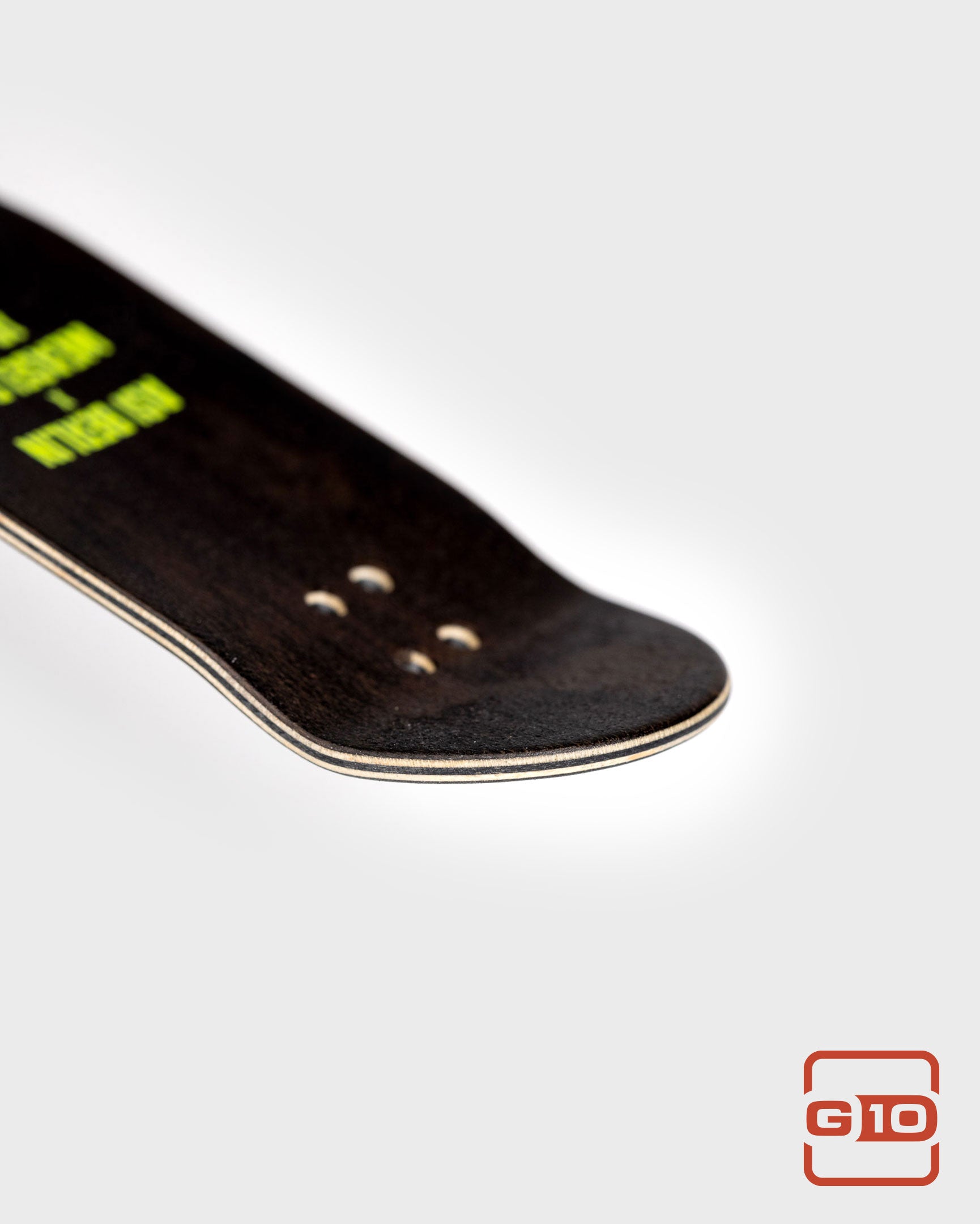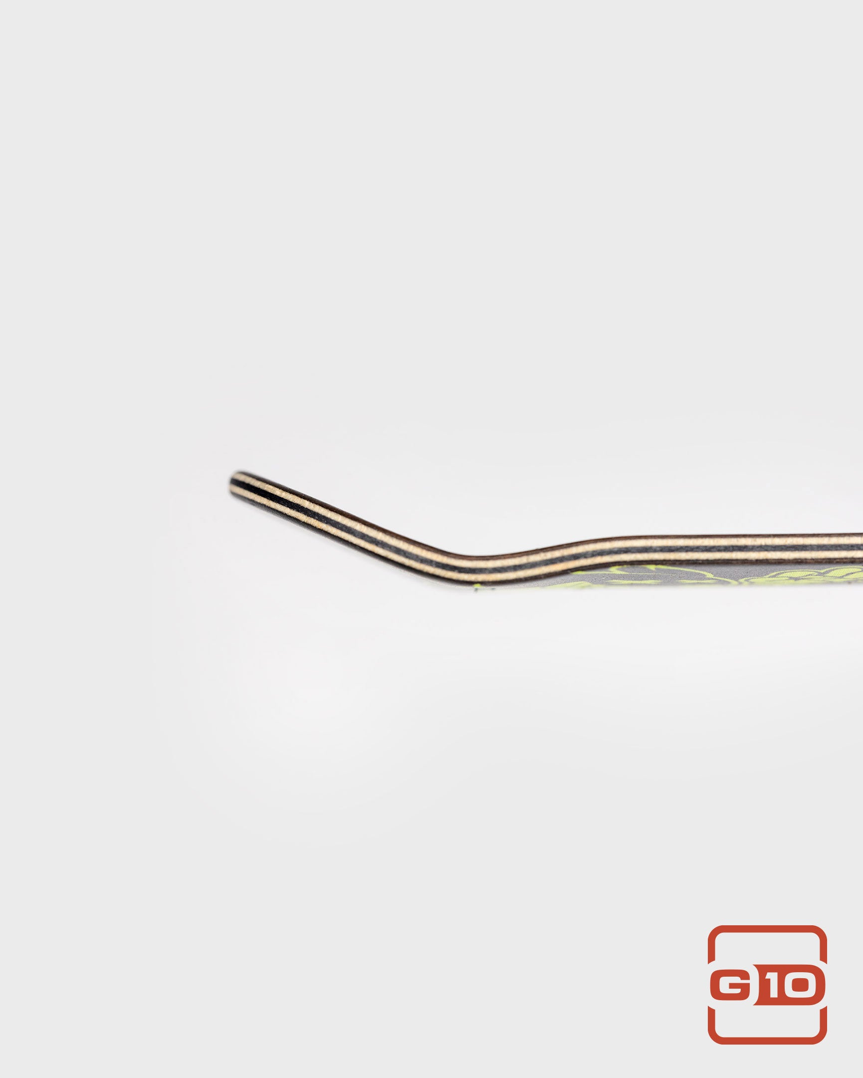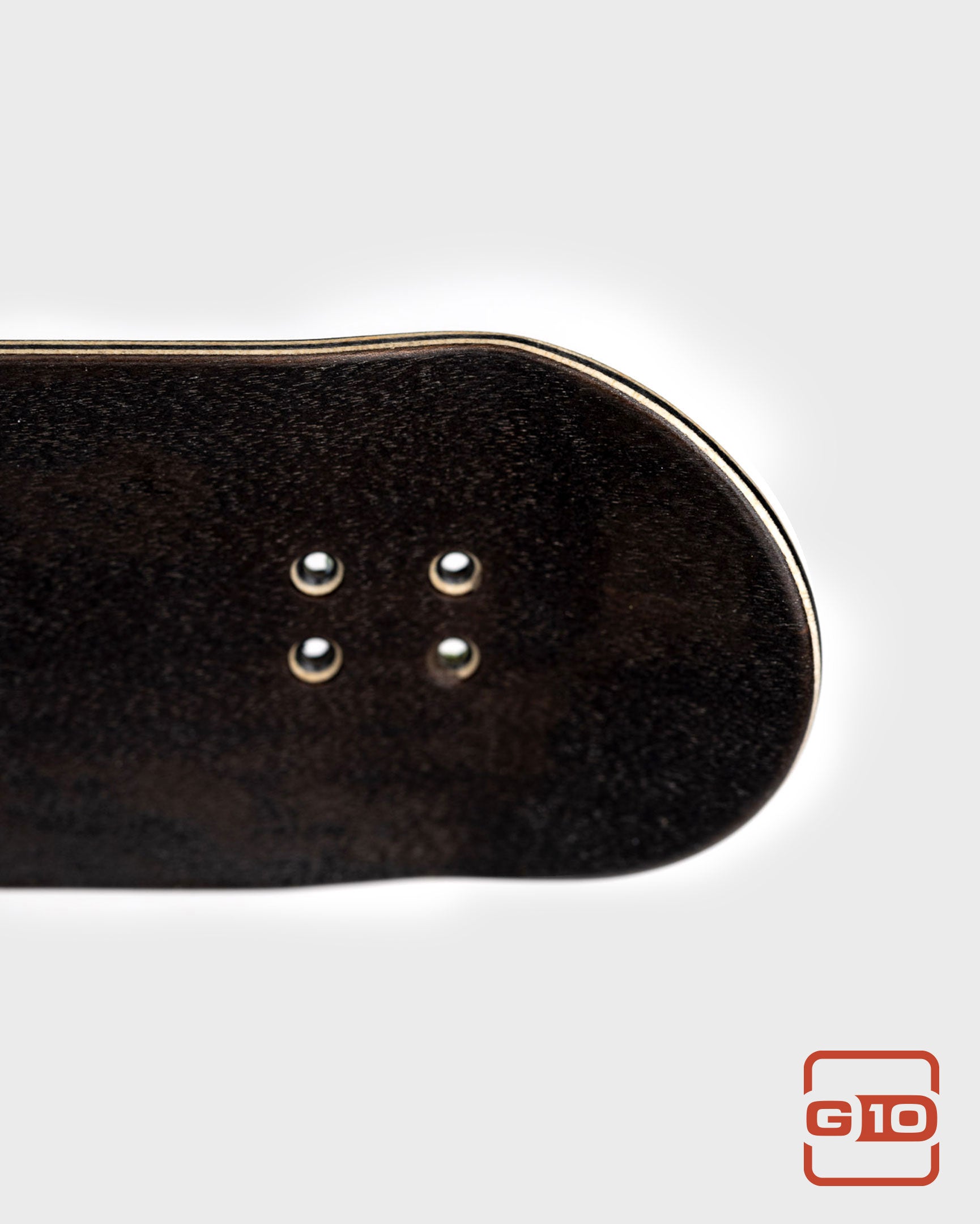This is the gnarliest deck we make. They take a lot of extra time and effort, but the feeling of one of these is totally worth it. The ply layup is unconventional with two 45 degree maple plies sandwiched with two lengthwise plies and the G10 layer right in the middle. This is the formula for unrivaled pop and torsional stiffness! Seriously, take a deck you have, and one of these, twist em both, and feel the unrivaled nastiness of the G10.