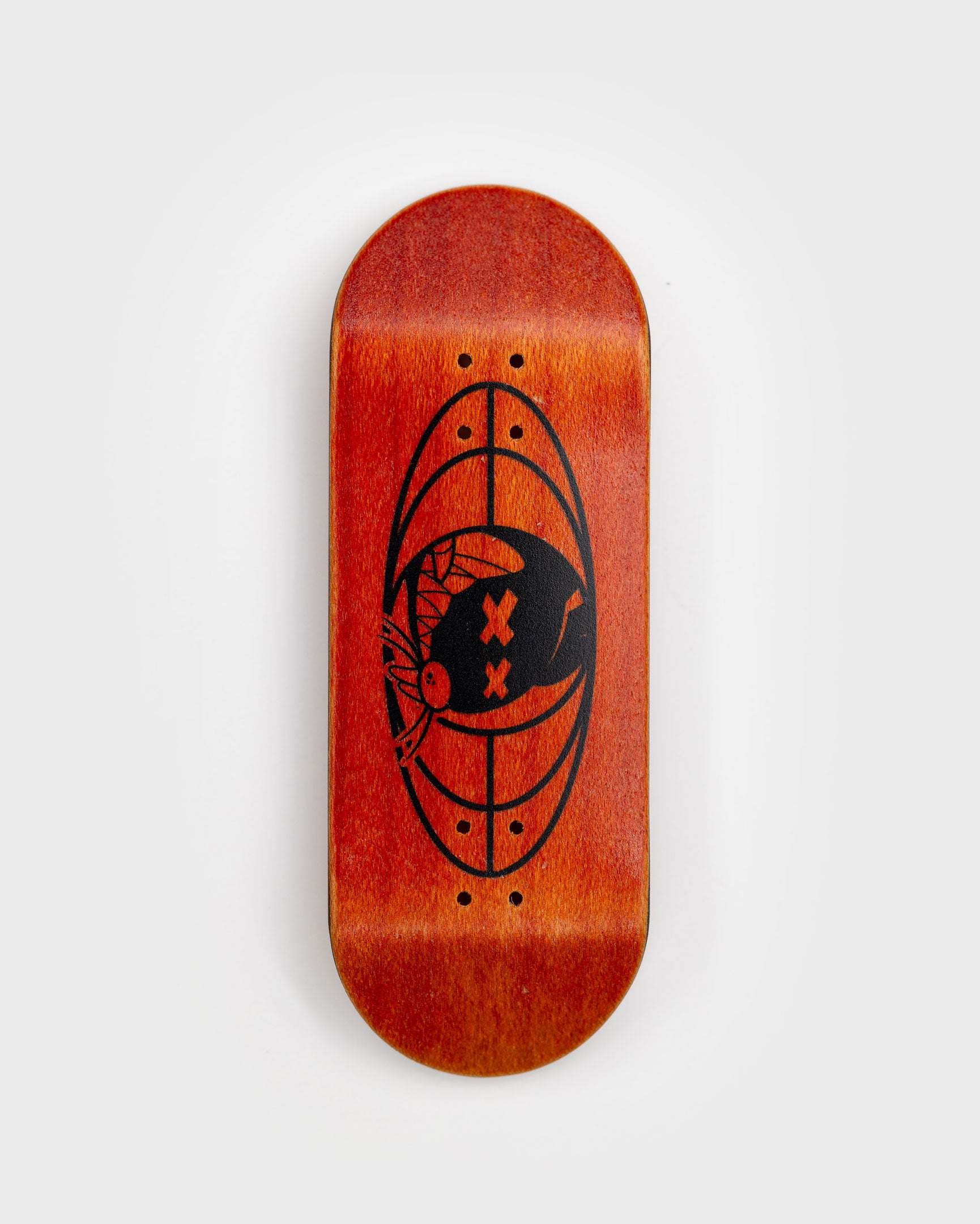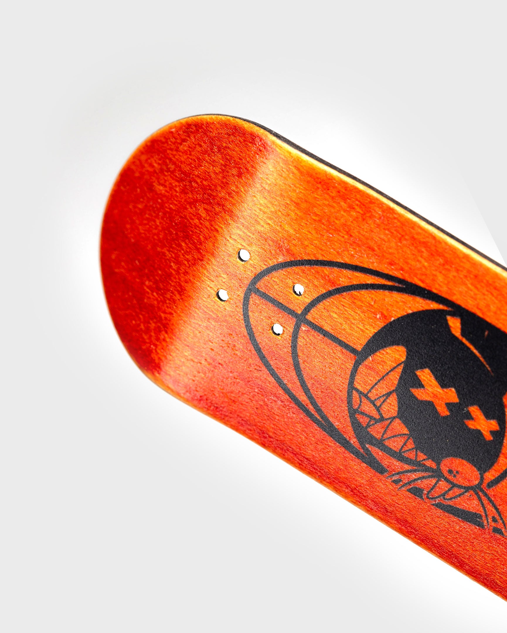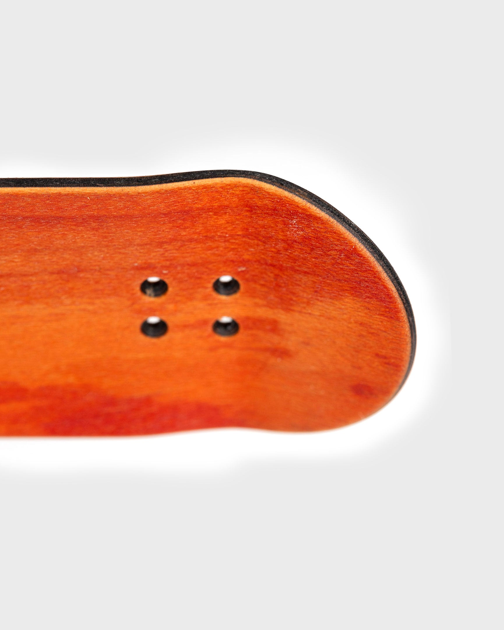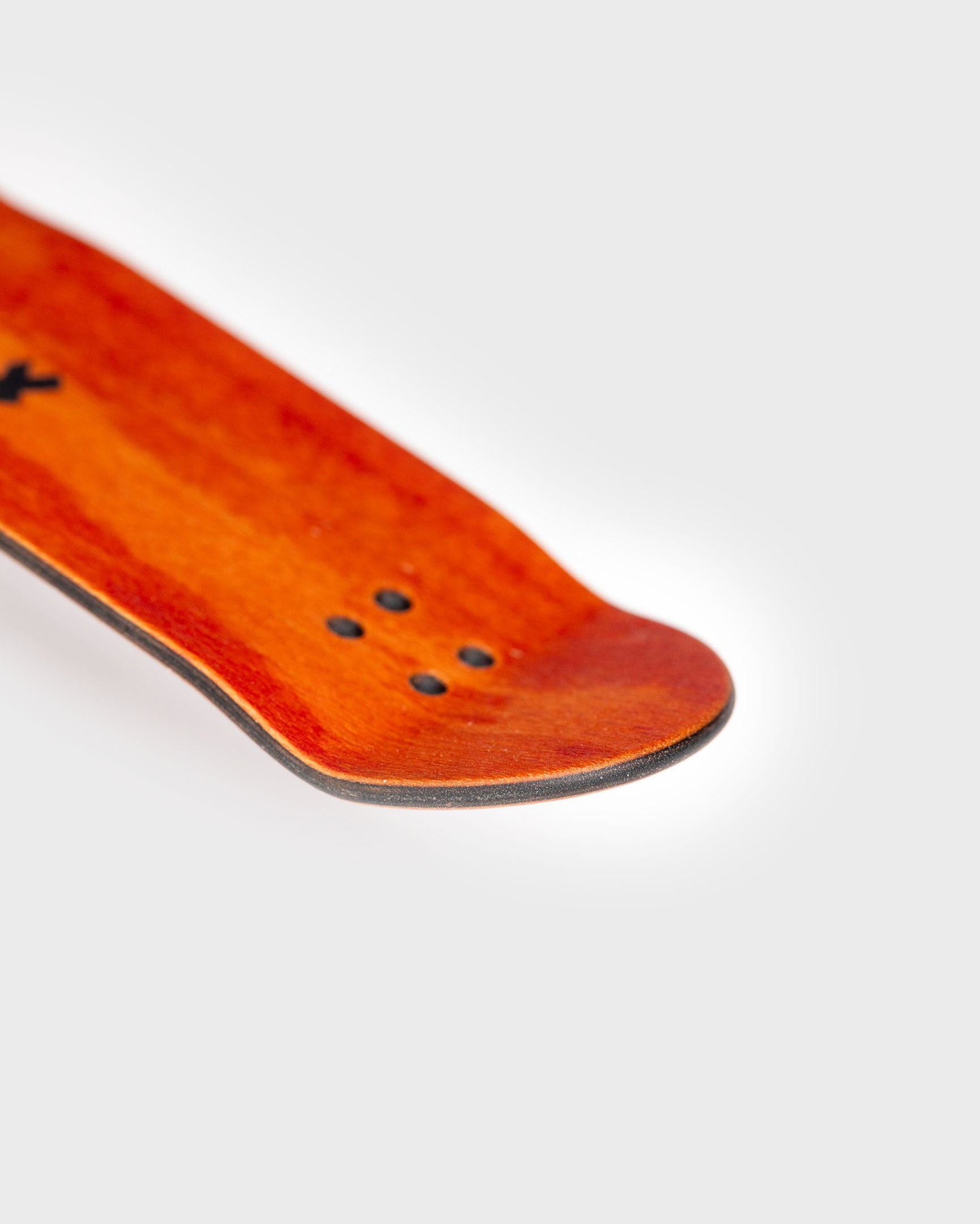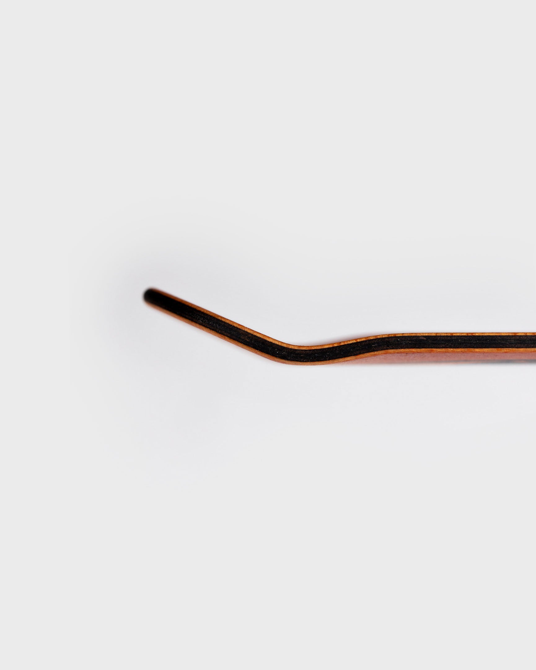 Orange top and bottom plies with all three middle plies blacked out! It's like a... reverse cheese sandwich! 5-ply hand-dyed maple. Black graphic on dyed wood grain.