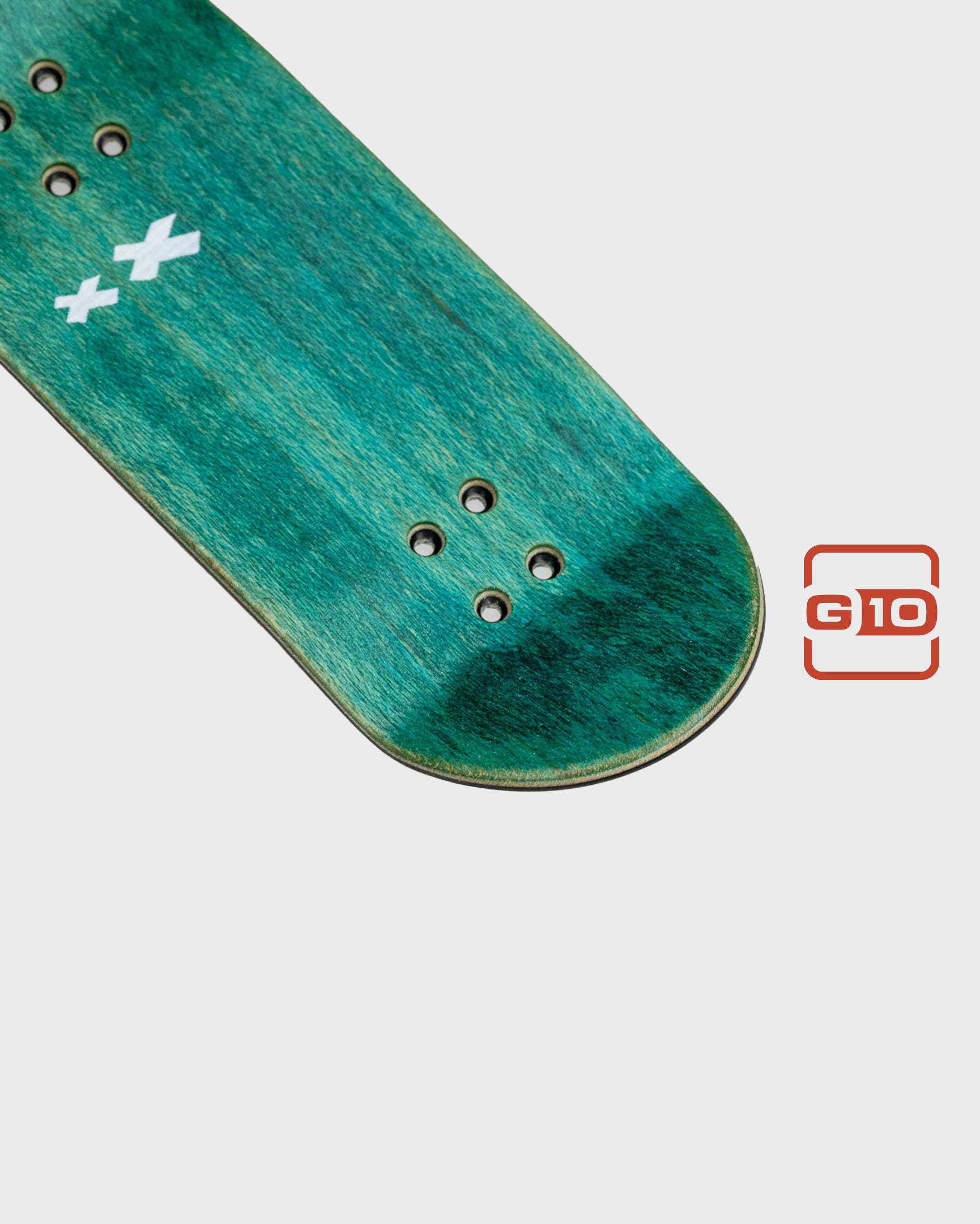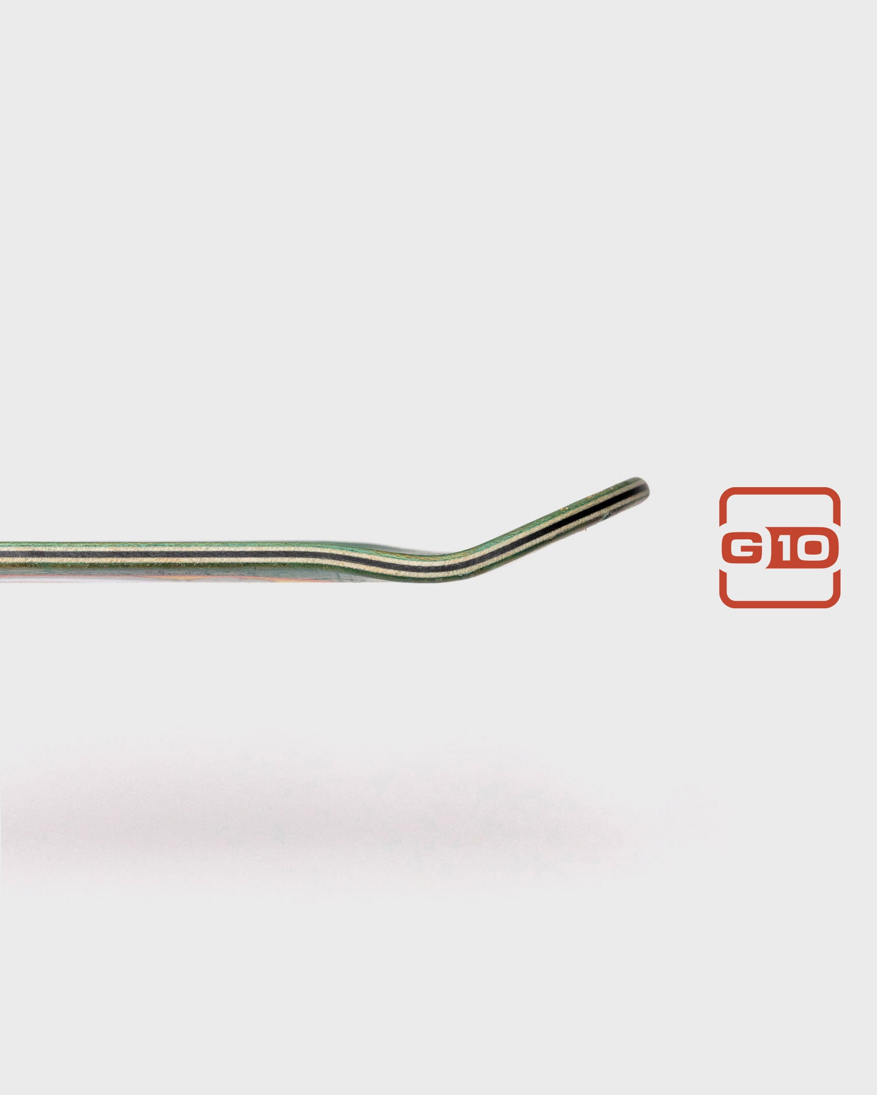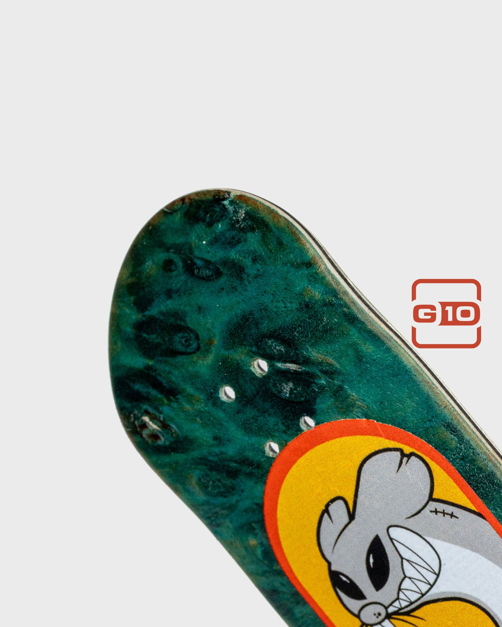 This is the gnarliest deck we make. They take a lot of extra time and effort, but the feeling of one of these is totally worth it. The ply layup is unconventional with two 45 degree maple plies sandwiched with two lengthwise plies and the G10 layer right in the middle. This is the formula for unrivaled pop and torsional stiffness! Seriously, take a deck you have, and one of these, twist em both, and feel the unrivaled nastiness of the G10.