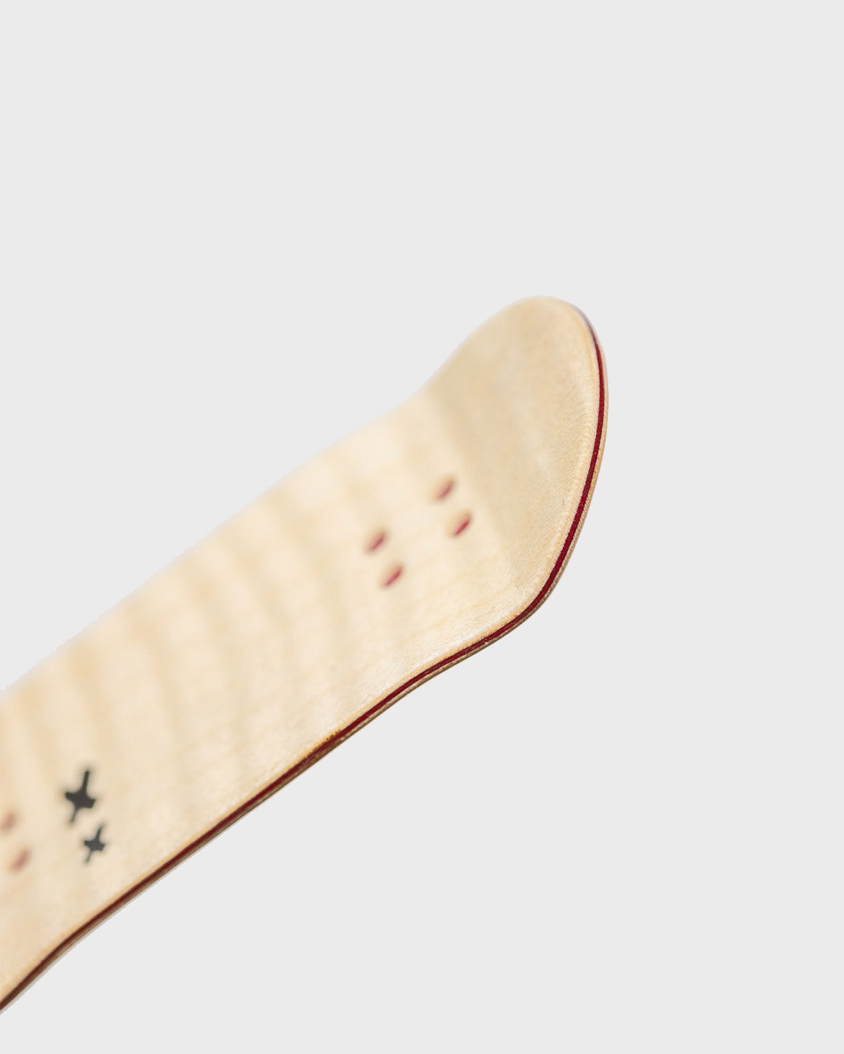 This fingerboard deck is a twin POPsicle inspired shape with switch/nollie friendly kicks and a slightly lower concave. This shape is perfect for skating and filming lines with shuvits/varials/hardflips, etc.