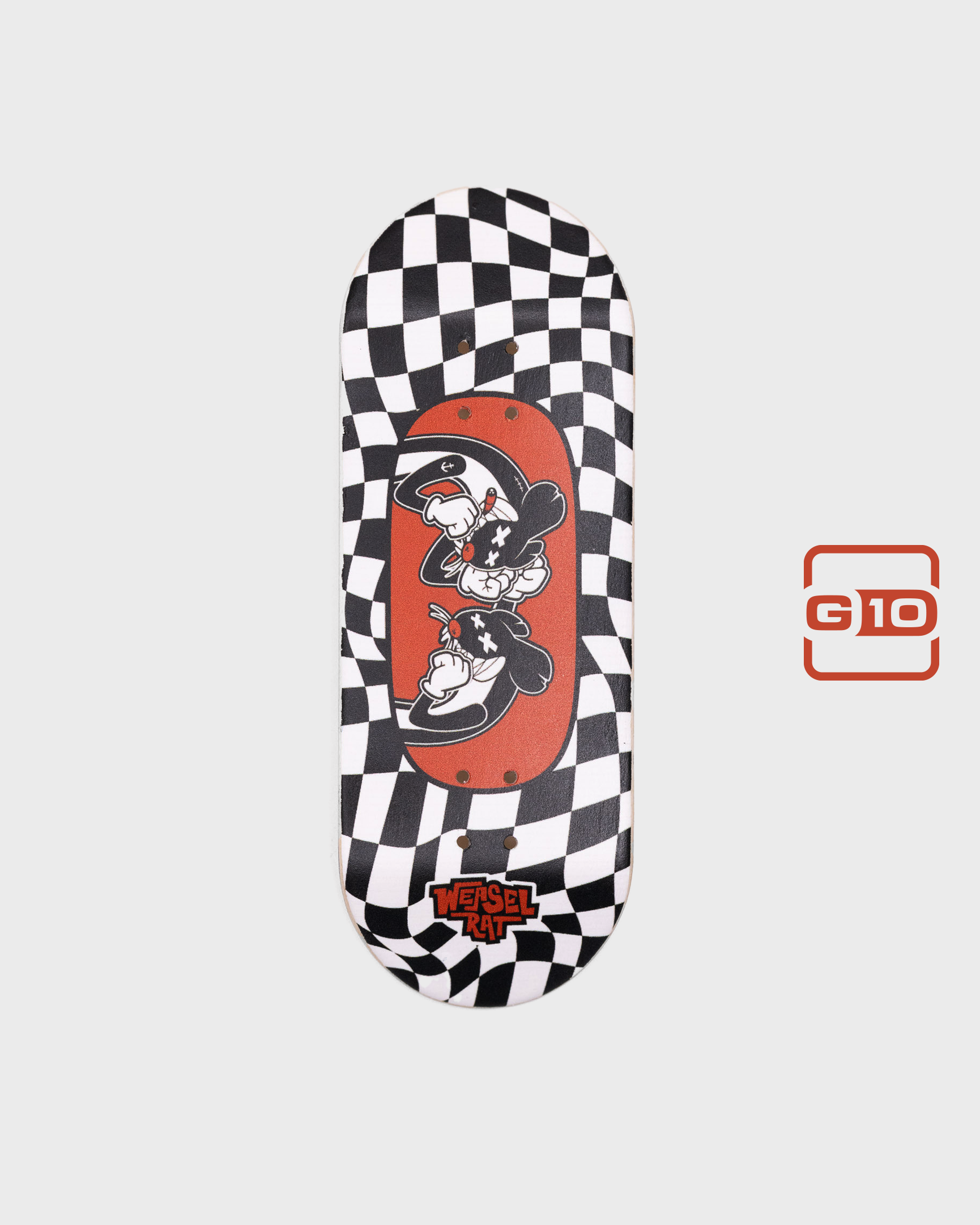 This Weasel Twin has a G10 glass ply in the middle. It's the same stuff they make knife and gun handles out of. It's tough as nails and as close to indestructible as we've come with a fingerboard deck. This time, instead of the bottom, we put that shit in the middle. You get all the familiar cozy feelings of hard wood on your fingers, with so much extra stiffness, you'll need an onion browser to see the photos we took of it.